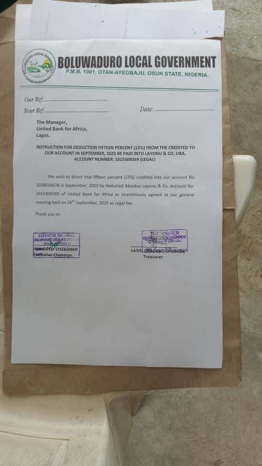 “This Honourable House has been made aware that certain Local Government Areas in Osun State including but not limited to Boluwaduro Local Government have issued financial instructions authorising deductions from their accounts in favour of private parties. One such instance is the instruction to deduct 15 percent of funds received in September 2025, allegedly authorised by the Local Government Treasurer and Chairman.